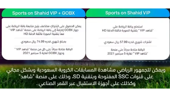 - باقة Sports on Shahid VIP + GOBX: (سعرها 74.99 ريال سعودي شهرياً – الباقة متاحة مجاناً على منصة شاهد vip وجهاز GOBX لغاية 5 سبتمبر 2021).